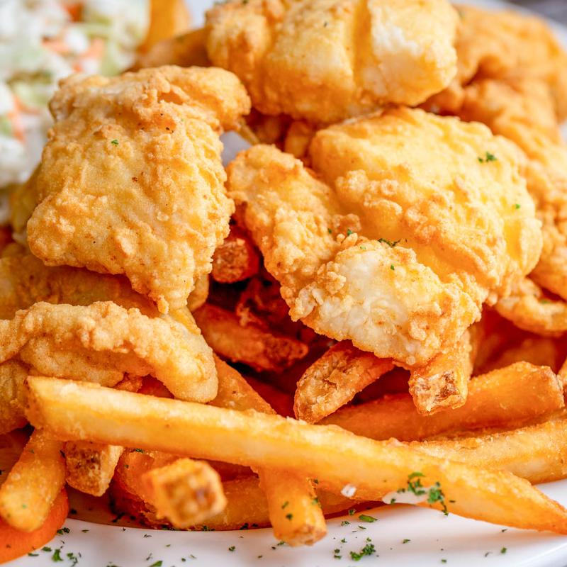 Fresh premium chicken tenderloins coated with a traditional New England style breading and deep fried, served over French fries and accompanied with your favorite dipping sauce